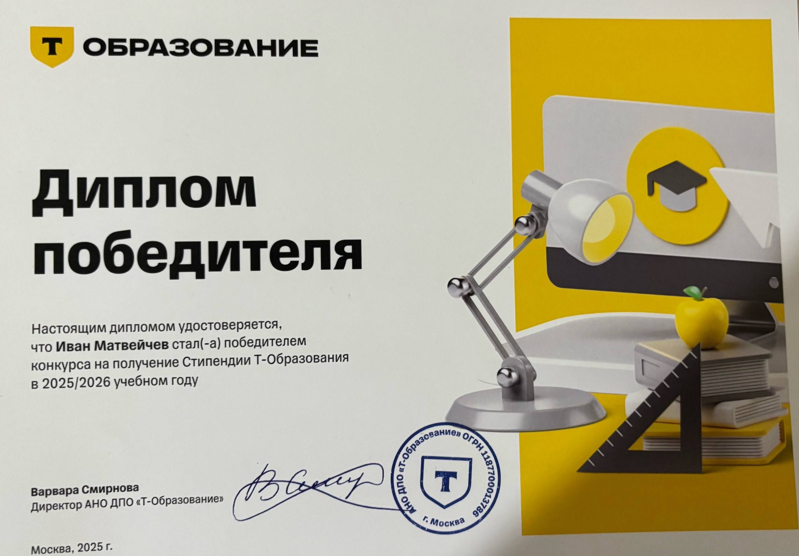 Состоялась церемония награждения обладателей образовательных стипендий от Т-банка в рамках программы Т-образования. Эта инициатива призвана поддержать талантливую молодежь, добившуюся значительных результатов в технической сфере, включая участие в олимпиадах и хакатонах. По итогам конкурса победителями стали 102 участника, среди них - студенты Института компьютерных наук ЛГТУ Иван Матвейчев в направлении"Разработка" и Александр Пахомов в направлении "Аналитика".