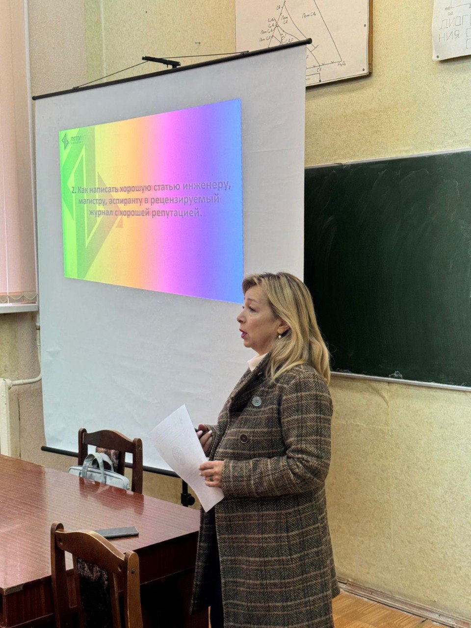 Доклад заведующего кафедрой М.А. Гончаровой осветил изменения в базовых системах научного цитирования, произошедшие в 2025 году. Были рассмотрены новые подходы к оценке публикаций и требования к индексированию журналов. Затем участники получили практические советы по написанию качественных инженерных статей, предназначенных для публикационного процесса в престижных журналах с высоким уровнем репутации.