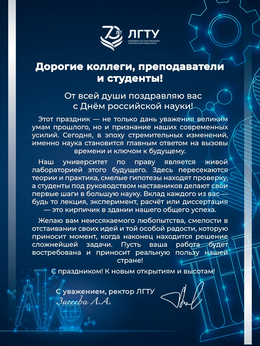 Поздравление с Днём российской науки ректора ЛГТУ Л.А. Загеевой!