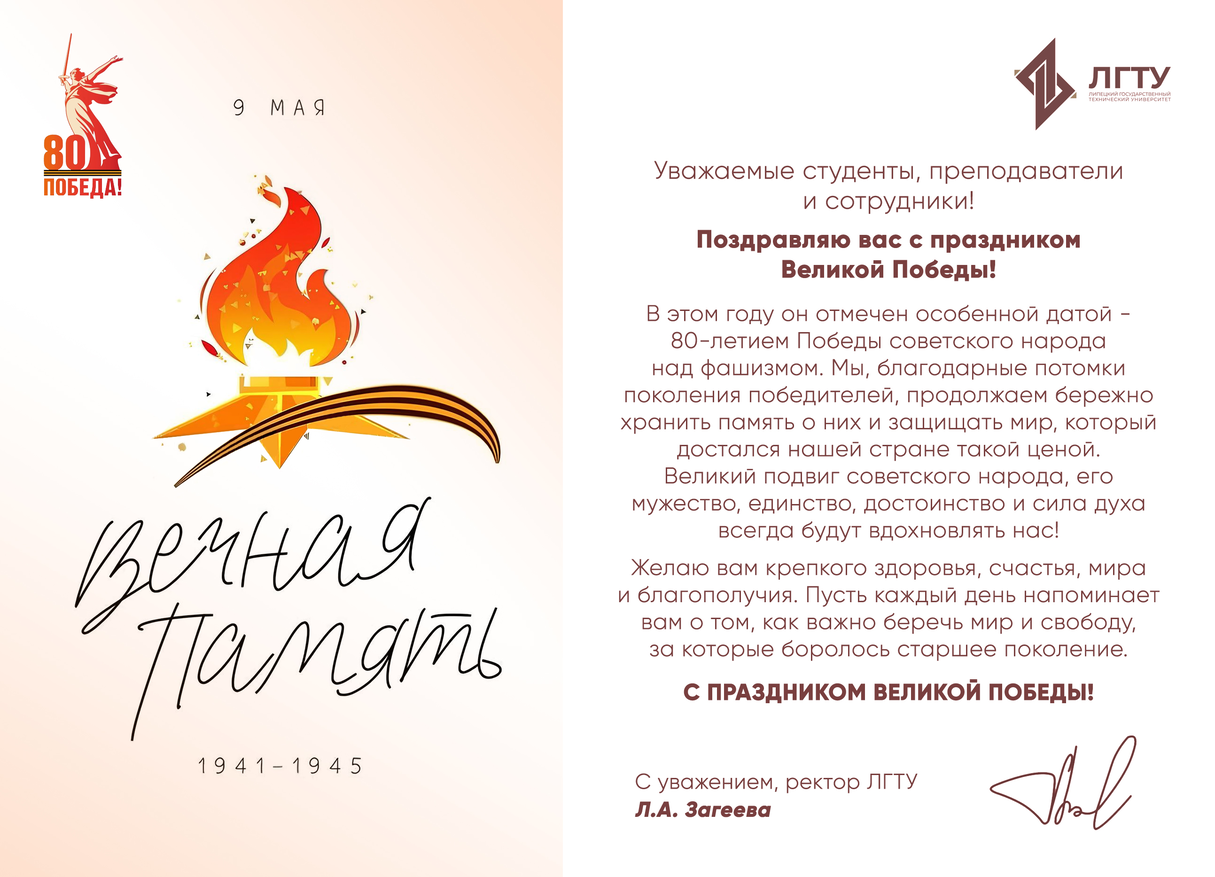 Поздравление ректора ЛГТУ Загеевой Лилии Александровны с праздником Великой Победы
