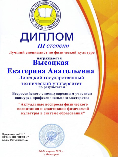 Высоцкую Екатерину Анатольевну – и.о. заведующего кафедрой физвоспитания, с заслуженной наградой – Дипломом III степени по результатам Всероссийского с международным участием конкурса профессионального мастерства «Актуальные вопросы физического воспитания и адаптивной физической культуры в системе образования».