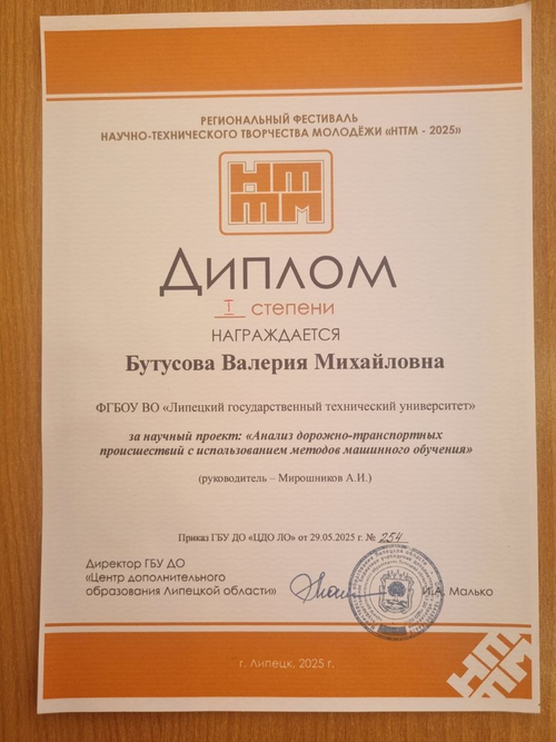 Диплом I степени получила студентка группы ПМ-21 Бутусова Валерия на конкурсе научно-технического творчества молодежи НТТМ-2025.