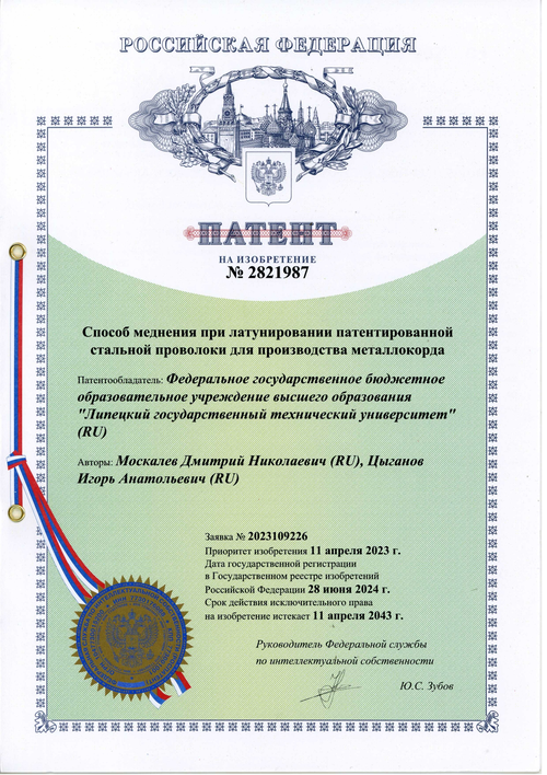 Федеральной службой по интеллектуальной собственности Российской Федерации выдан патент № 2821987 на изобретение «Способ меднения при латунировании патентированной стальной проволоки для производства металлокорда».