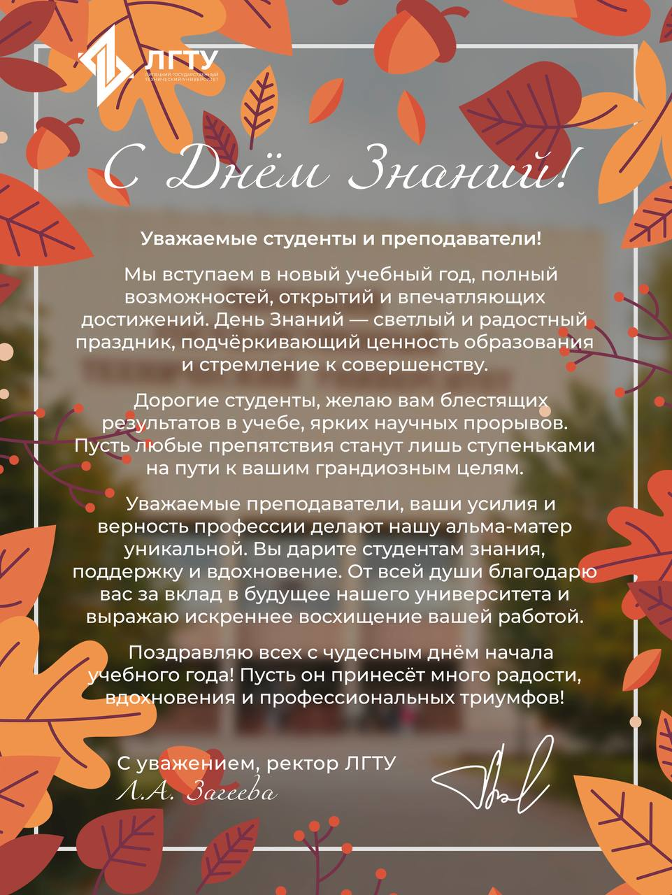 Поздравление ректора ЛГТУ Загеевой Лилии Александровны с Днём Знаний!