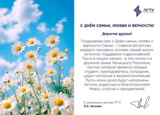 Поздравление ректора ЛГТУ Загеевой Лилии Александровны с Днём семьи, любви и верности