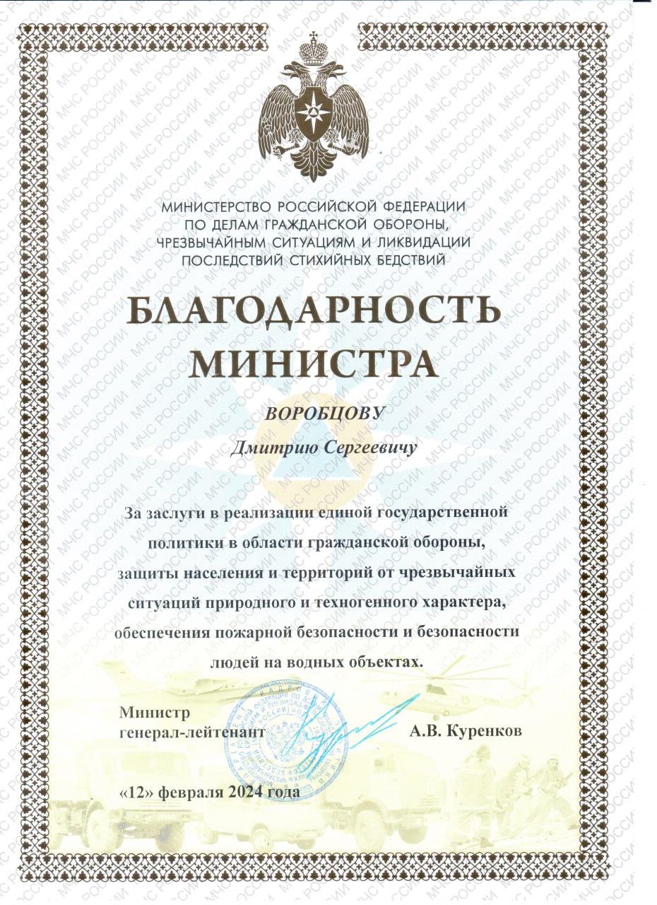 Благодарность Министра МЧС России стала заслуженной оценкой его достижений: Дмитрий является победителем и призером Кубка мира, первенств и чемпионатов России.