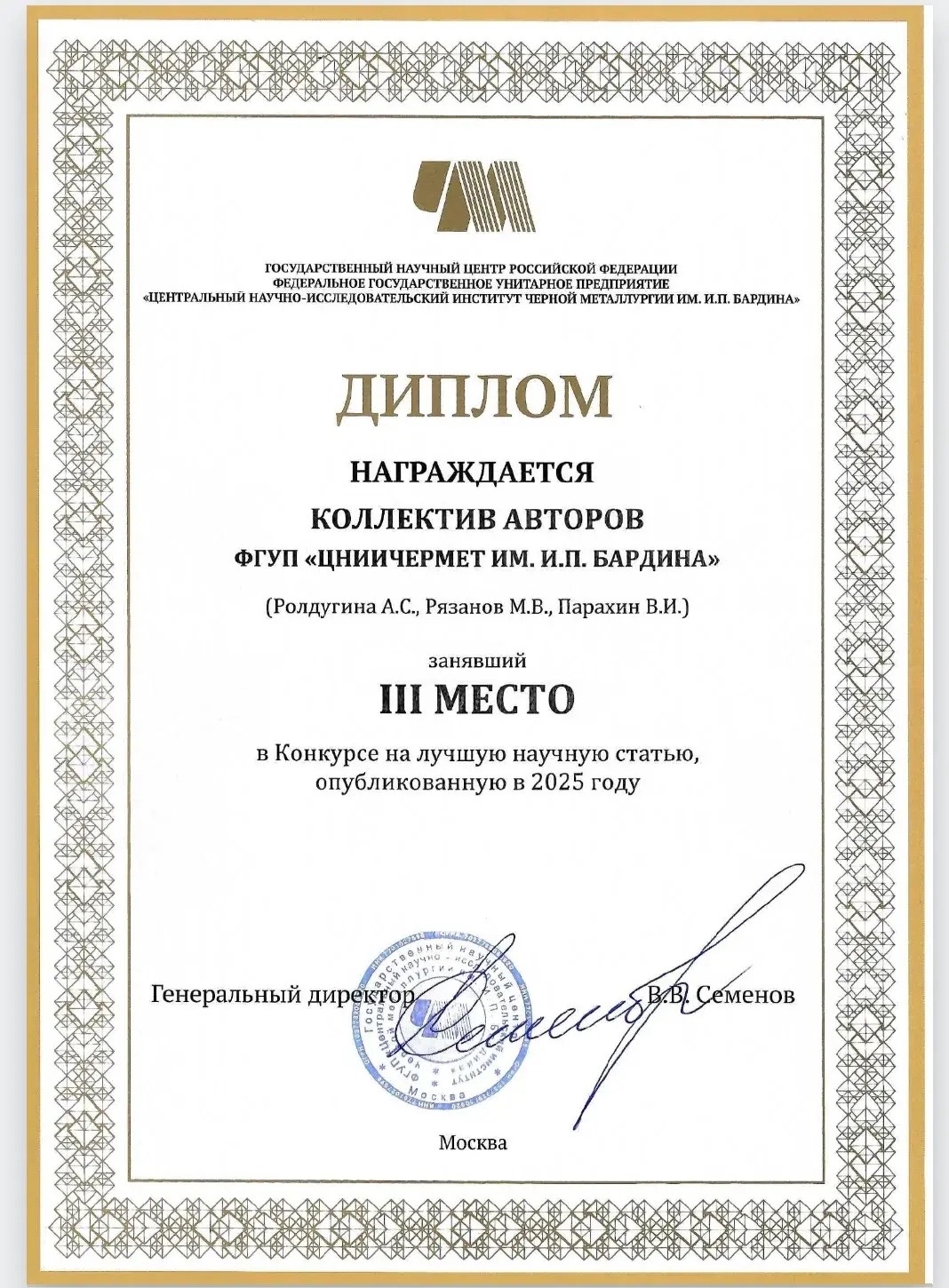 Научная статья коллектива авторов, в состав которого входила Анна, была отобрана для участия в конкурсе ГНЦ ФГУП «ЦНИИчермет им. И.П. Бардина» на лучшую публикацию 2025 года и по итогам удостоена Диплома III степени. Отметим, что данная работа выполнена в рамках диссертационного исследования Анны.