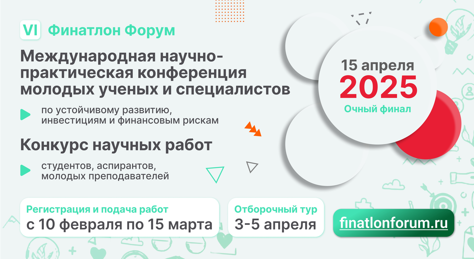 По 15 марта 2025 г. открыта регистрация и сбор научных работ студентов, аспирантов, молодых преподавателей возрасте до 35 лет для участия в дистанционном отборочном туре VI Финатлон форума – международной научно-практической конференции молодых ученых и специалистов по устойчивому развитию, инвестициям и финансовым рискам, которая пройдет в Москве 15 апреля 2025 г.