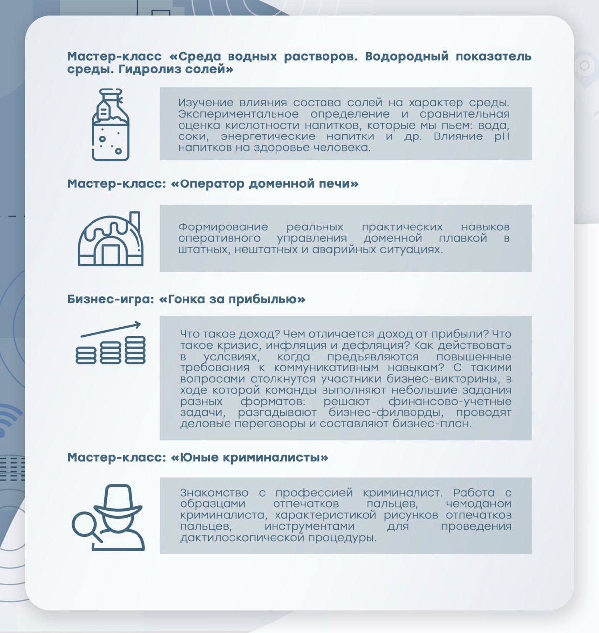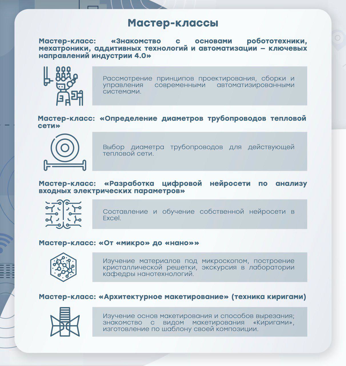 Мы открываем двери наших лабораторий и аудиторий для самых смелых и любознательных. На наших мастер-классах вы не просто послушаете, а сделаете сами под руководством наших крутых преподавателей. Поймёте, каково это — быть инженером, IT-специалистом, технологом — кем вы хотите стать.
