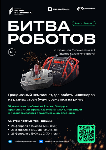 В соответствии с распоряжением Правительства Российской Федерации от 11 апреля 2023 г. № 889-р Департамент государственной молодежной политики и воспитательной деятельности сообщает о проведении суперфинала Международного чемпионата по битве роботов в рамках Международного мультиспортивного турнира «Игры будущего» в 2024 году в г. Казани, организованного в соответствии с Указом Президента Российской Федерации от 19 декабря 2022 г. № 927.