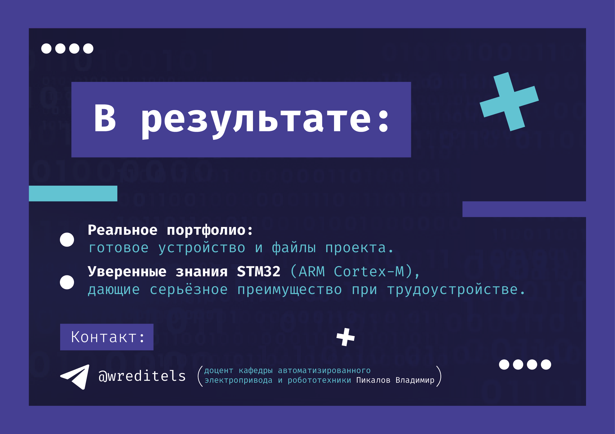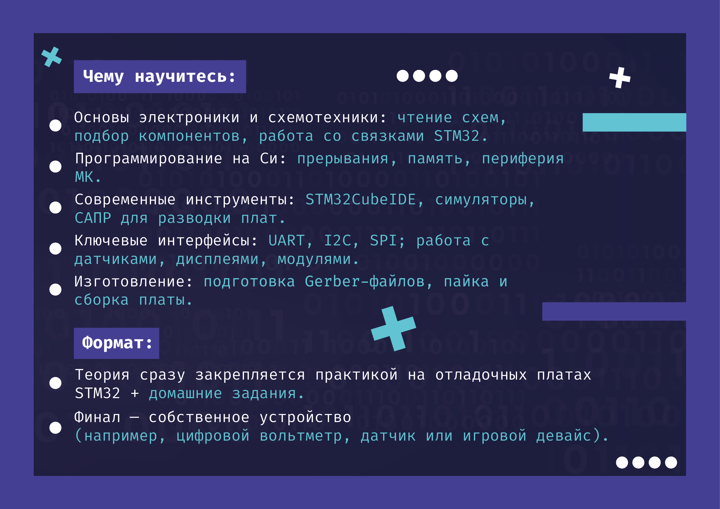 - Работе с современными инструментами разработчика, такими как STM32CubeIDE, симуляторами и САПР для разводки плат ⚙️