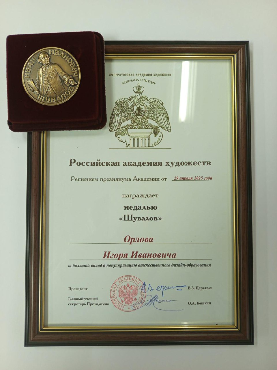 Решением президиума Российской академии художеств медалью «Шувалова» за большой вклад в популяризацию отечественного дизайн – образования награжден заведующий кафедрой дизайна и художественной обработки материалов, доктор искусствоведения, профессор, Почетный член Российской академии художеств Орлов Игорь Иванович.