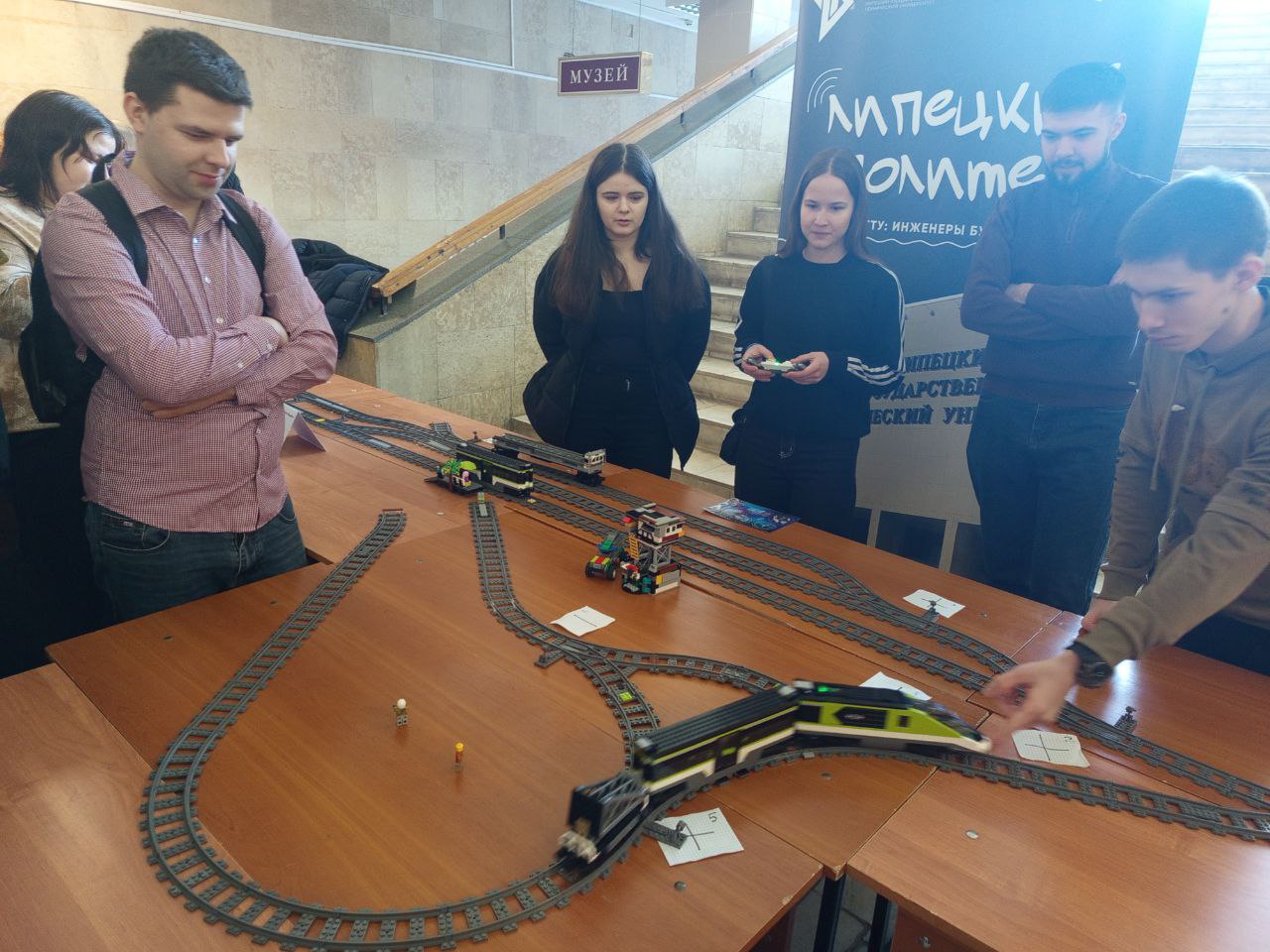 На Интерактивной выставке «ЛГТУ: Инженеры будущего» наши работодатели помогали абитуриентам примерять на себя роль организаторов маневровой работы, учили ребят управлять движением железнодорожных составов.