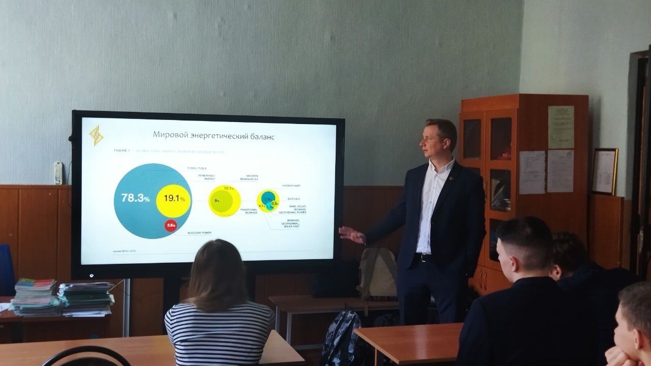 В рамках просветительской и профориентационной работы к.т.н., доцент кафедры «Промышленная теплоэнергетика» Картель Александр Юрьевич выступил перед школьниками 11 класса гимназии №19. Рассказал о современных трендах в «зеленой» энергетике, о работе университета в этом направлении и пригласил в специально организованный ФТФ и ИСФ класс в ЛГТУ «Энергетика и строительство».
