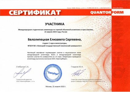 Елизавета Белолипецкая , магистрант ЛГТУ – стала победителем 11-ой Всероссийской Олимпиады по технологиям обработки давлением.В национальном этапе приняли участие студенты из 17 вузов России.