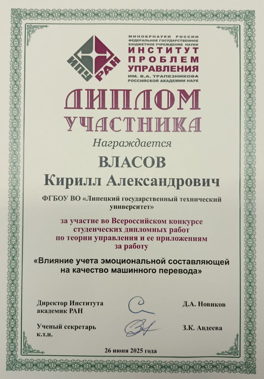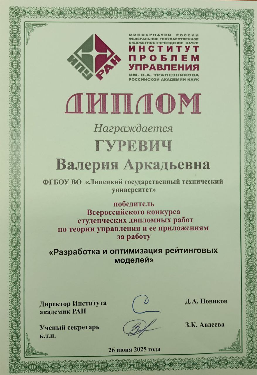 Сотрудники и аспиранты института компьютерных наук приняли участие в работе XXI Всероссийской школы-конференции молодых ученых "Управление большими системами". Конференция, посвященная современным методам управления организационными, социально-экономическими, техническими и робототехническими системами, информационным технологиям и искусственному интеллекту в управлении, а также математическим основам теории управления, прошла на базе ФГБОУ ВО «Тамбовский государственный технический университет» при поддержке Института проблем управления им. В.А. Трапезникова РАН. Сотрудники кафедры прикладной математики и системного анализа представили доклад на тему "Комплексный подход к выявлению узких мест в городской транспортной сети", а кафедры автоматизированных систем управления - доклад "Использование методов математического ремоделирования в контексте рекомендательных систем". Стоит отметить, что оба исследования выполнены при поддержке Российского научного фонда в рамках конкурса «Проведение фундаментальных научных исследований и поисковых научных исследований малыми отдельными научными группами» (руководители профессор Погодаев А.К., профессор Сараев П.В.). Кроме этого, в рамках конференции состоялось награждение участников и победителей Всероссийского конкурса студенческих дипломных работ по теории управления и её приложениям - Кирилла Власова, Валерии Гуревич и Анатолия Кирьяновича Погодаева - научного руководителя Валерии.